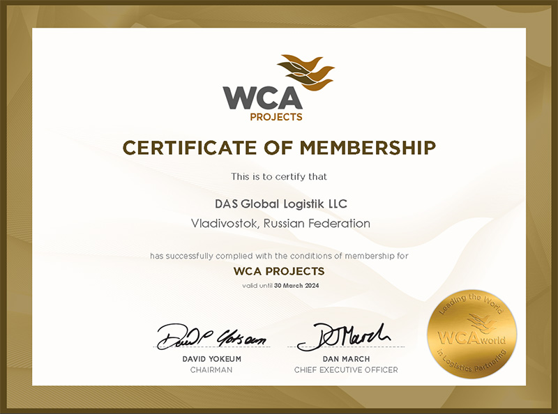 - Сертификат WCA PROJECTS, подтверждающий членство в международной ассоциации WCA PROJECTS по проектным и негабаритным грузам на 2022 гг.