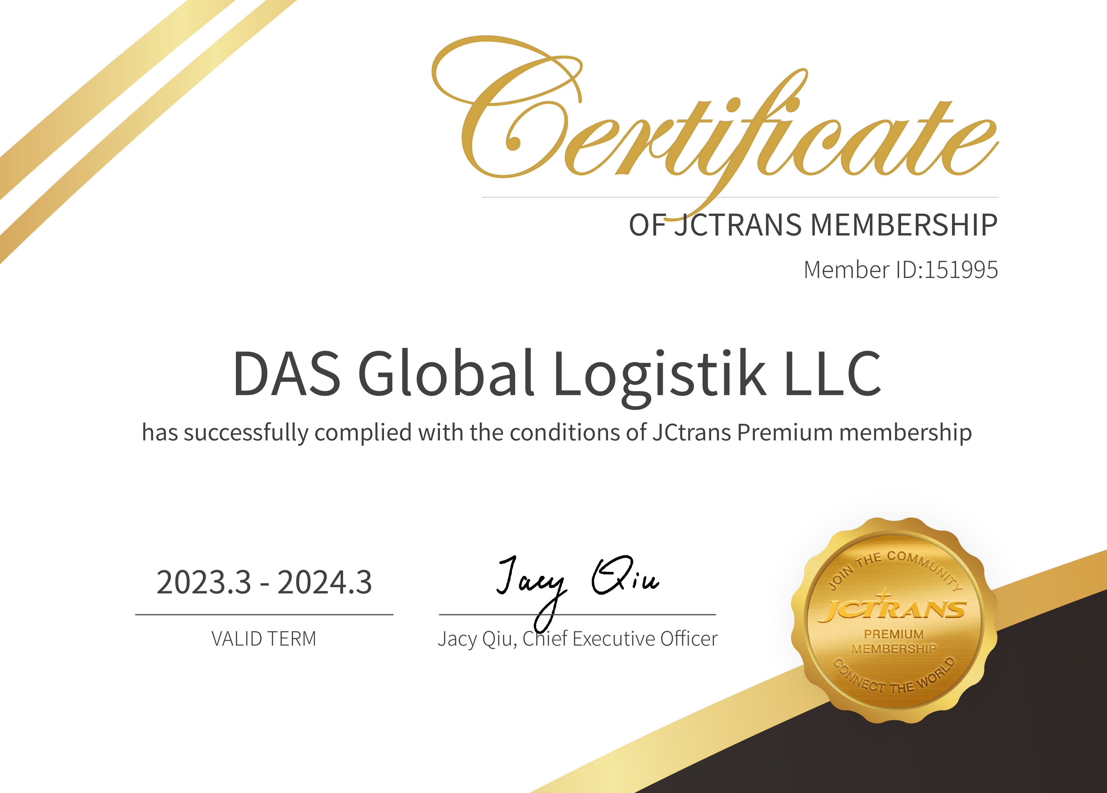 Спешим поделится радостной новостью! Наша компания DAS GLOBAL LOGISTIK присоединилась к членству в JCtrans, где сейчас находится более 10126 международных экспедиторов.